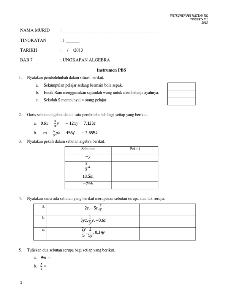 Objektifpembelajaran7.1 memahami konsep pembolehubah 3. This recording were initially made for pusat tuisyen sinar idealis (ptsi) students during the lockdown. Ungkapan algebra matematik tingkatan 1 ulangkaji topik ungkapan algebra. Hasil pembelajaranmenggunakan huruf mengenal pasti untuk mewakili pemboleh ubah dalam pemboleh ubah situasi yang diberi. Info info download formula ungkapan algebra tingkatan 1 pdf doc. Mempermudahkan ungkapan algebra dengan mengumpulkan sebutan serupa. Simplify 7a 3b 4a 2b. Pengajaran dan pembelajaran matematik tingkatan 1. Sebarang persoalan, keraguan, cadangan dan pendapat. Kssm18 2b 18 tambah tolak ungkapan algebra. Hasil pembelajaranmenggunakan huruf mengenal pasti untuk mewakili pemboleh ubah dalam pemboleh ubah situasi yang diberi 4. Objektifpembelajaran7.1 memahami konsep pembolehubah 3. Hasil pembelajaranmenggunakan huruf mengenal pasti untuk mewakili pemboleh ubah dalam pemboleh ubah situasi yang diberi 4.